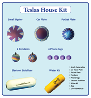 4 Phone Tags - may alter biological effects coming from mobile or cordless phone transmissions. 2 Personal Pendant - strengthens the auric field, helps concentration & also helps A.D.D children to cope without drugs. Pocket Plate - helps with minor pains or bruises & can be used to alter the taste of water. Car Plate - helps alter the aggressive fields coming from the electronics in cars. Small Oyster Plate - helps households cope with Geopathic Stress, EM Radiation & air ionisation. The Electron Stabiliser - fits on to a power cord and turns the chaotic frequencies in the wiring to coherent. The Water Kit - puts life force into tap water, tastes & feels like rain water (no ongoing costs.)
